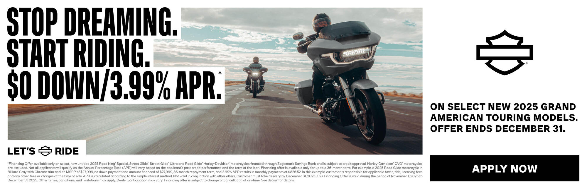 *Financing Offer available only on select, new untitled 2025 & 2024 Road King® Special, Street Glide®, Street Glide® Ultra and Road Glide® Harley-Davidson® motorcycles financed through Eaglemark Savings Bank and is subject to credit approval. Harley-Davidson® CVO™ motorcycles are excluded. Not all applicants will qualify as the Annual Percentage Rate (APR) will vary based on the applicant’s past credit performance and the term of the loan. Financing offer is available only for up to a 36-month term. For example, a 2025 Road Glide® motorcycle in Billiard Grey with Chrome trim and an MSRP of $27,999, no down payment and amount financed of $27,999, 36-month repayment term, and 3.99% APR results in monthly payments of $826.52. In this example, customer is responsible for applicable taxes, title, licensing fees and any other fees or charges at the time of sale. APR is calculated according to the simple interest method. Not valid in conjunction with other offers. Customer must take delivery by December 31, 2025. This Financing Offer is valid during the period of November 1, 2025 to December 31, 2025. Other terms, conditions, and limitations may apply. Dealer participation may vary. Financing offer is subject to change or cancellation at anytime. See dealer for details.