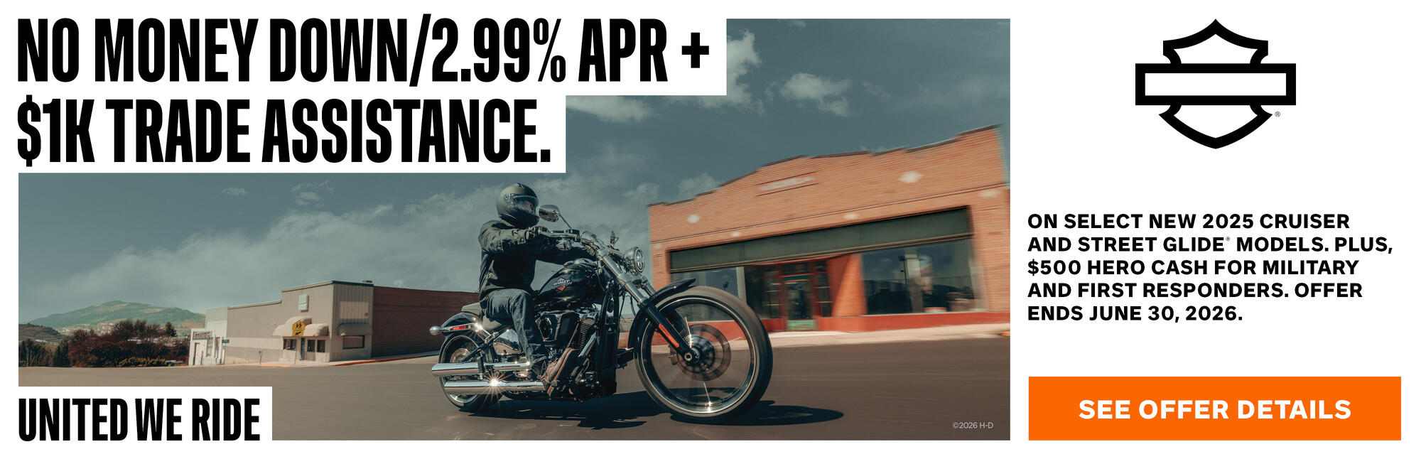 *Financing Offer available only on select, new untitled 2025 or 2024 Harley-Davidson® motorcycles financed through Eaglemark Savings Bank and is subject to credit approval. Not all applicants will qualify as the Annual Percentage Rate (APR) will vary based on the applicant’s past credit performance and the term of the loan. Financing offer is available only for up to a 36-month term. For example, a 2025 Road Glide® motorcycle in Billiard Grey with Chrome trim and an MSRP of $27,999, no down payment and amount financed of $27,999, 36- month repayment term, and 2.99% APR results in monthly payments of $814.12. In this example, customer is responsible for applicable taxes, title, licensing fees and any other fees or charges at the time of sale. APR is calculated according to the simple interest method. Not valid in conjunction with other offers. Customer must take delivery by June 30, 2026. This Financing Offer is valid during the period of April 1, 2026 to June 30, 2026. Other terms, conditions, and limitations may apply. Dealer participation may vary. Financing offer is subject to change or cancellation at anytime. See dealer for details.